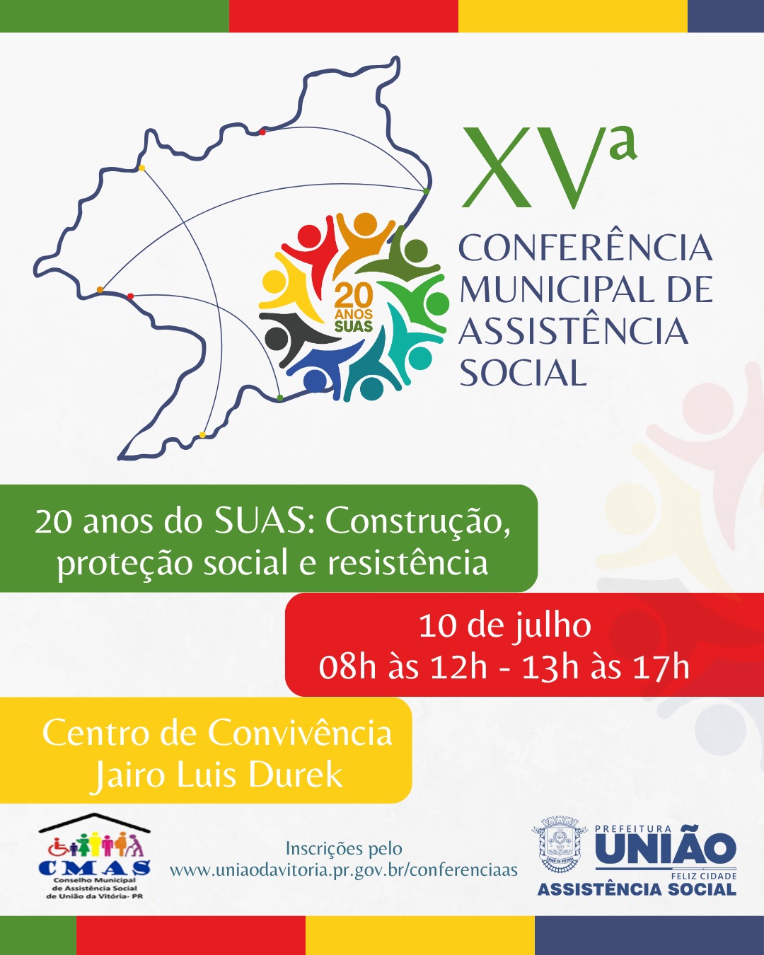 O Conselho Municipal de Assistência Social de União da Vitória, com o apoio da Secretaria Municipal de Assistência Social realizará no dia 10 de julho a 15ª Conferência Municipal de Assistência Social, com o tema “20 anos do SUAS: Construção, Proteção Social e Resistência”. As inscrições estão abertas e devem ser feitas de forma online.