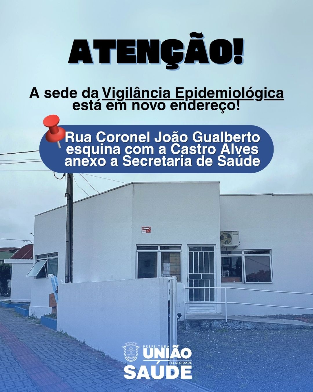 Secretaria Municipal de Saúde de União da Vitória informa a população que o atendimento da Vigilância Epidemiológica está em novo endereço, na rua Coronel João Gualberto, esquina com a Castro Alves anexo a Secretaria de Saúde.