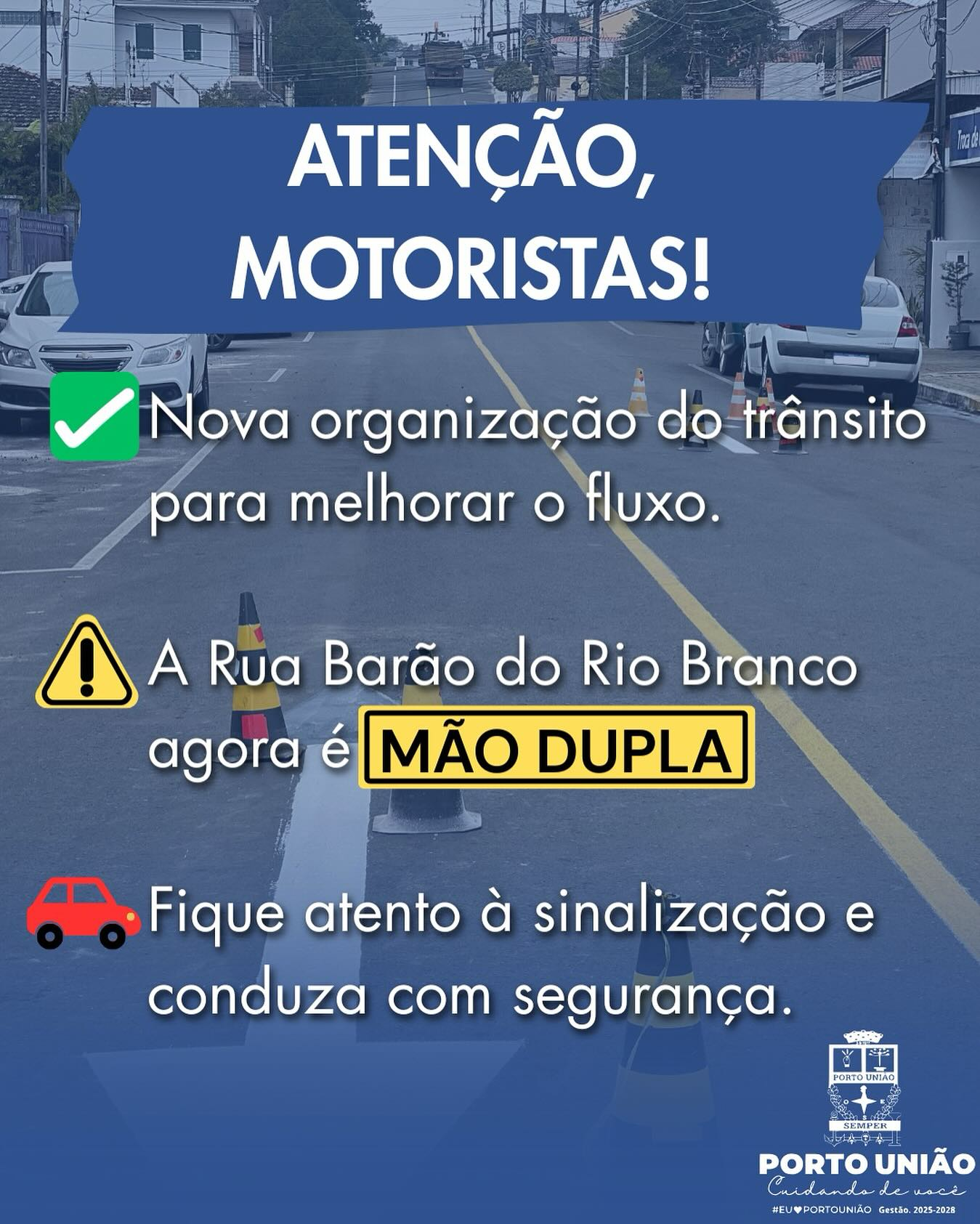 A Prefeitura de Porto União informa que a Rua Barão do Rio Branco passou a operar em mão dupla, com o objetivo de melhorar o fluxo do trânsito na região.