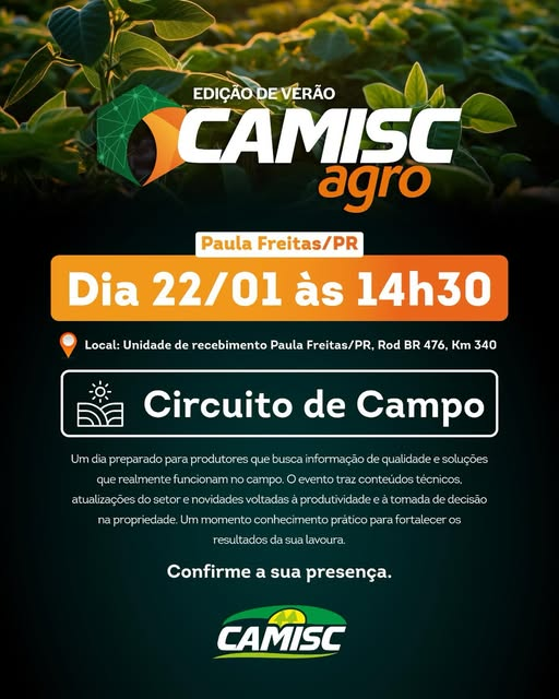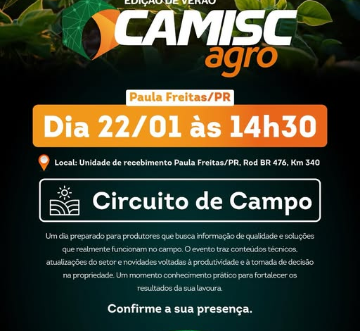 O município de Paula Freitas, no Sul do Paraná, será palco do Camisc Agro 2026, evento voltado ao fortalecimento do setor agropecuário e à difusão de conhecimento técnico para produtores rurais da região. A programação acontece no dia 22 de janeiro, a partir das 14h30, na Unidade de Recebimento de Paula Freitas, localizada às margens da BR-476, no km 340.